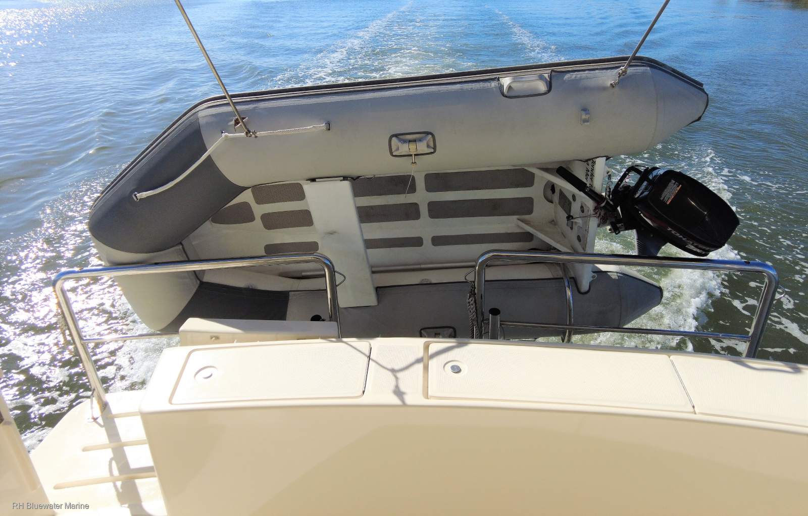 Rear transon door and rails, webber Q bbq stainless bait board full up tender brackets with rope pulley assist, Full walk around decks, easy engine room access roof access with hatch and ladder,